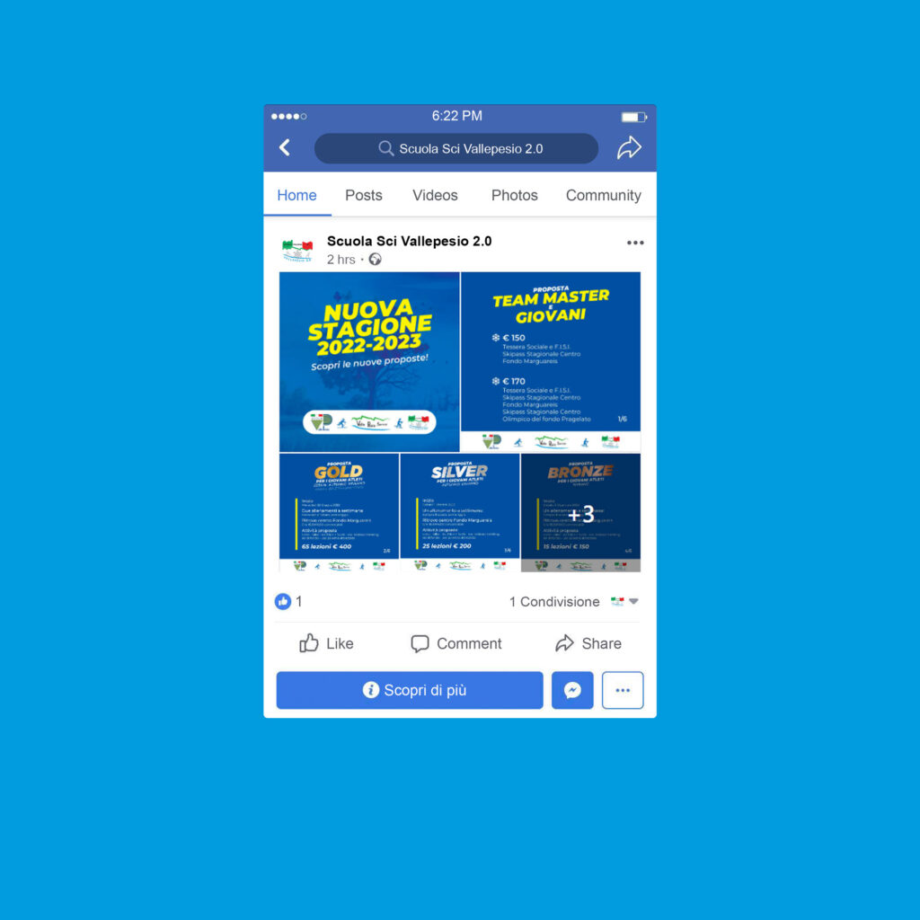 Seguiamo la pagina Facebook e Instagram di Scuola Sci Vallepesio 2.0, manteniamo attivi i profili con post accattivanti sulle novità della stagione, i loro corsi ed eventuali eventi.